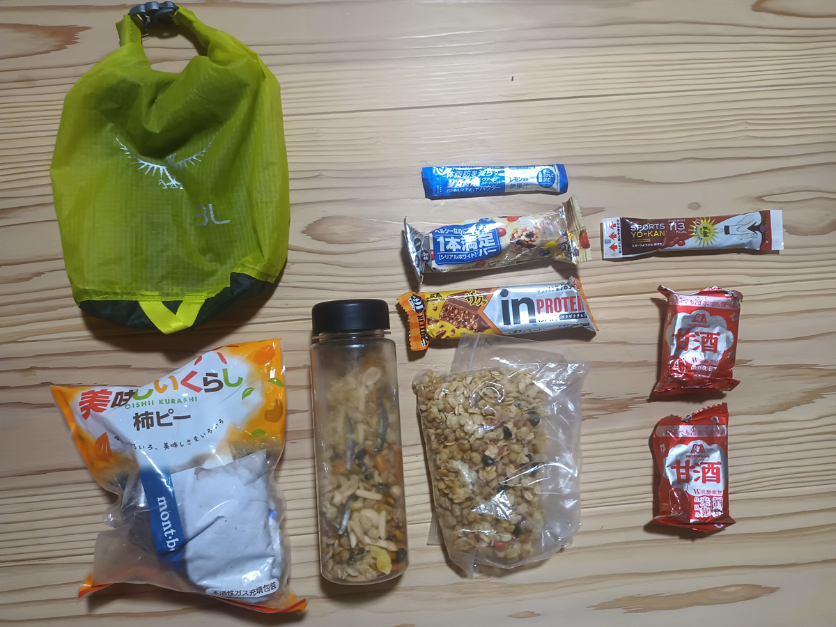下山時に余った 水1L、食料0.6kg(予備除く)